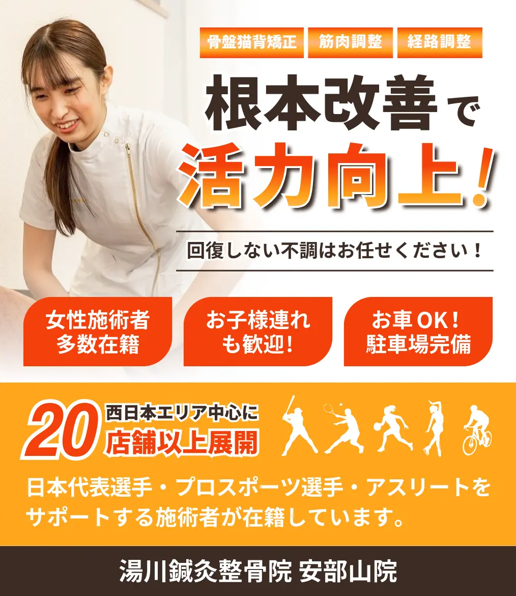 湯川整骨院 鍼灸院 安部山院では平日夜19時まで営業しているため、仕事終わりの方や、部活終わりの学生さんも通いやすくなっております。なかなか治らない身体の痛みでお悩みの方は、お気軽にご相談ください。